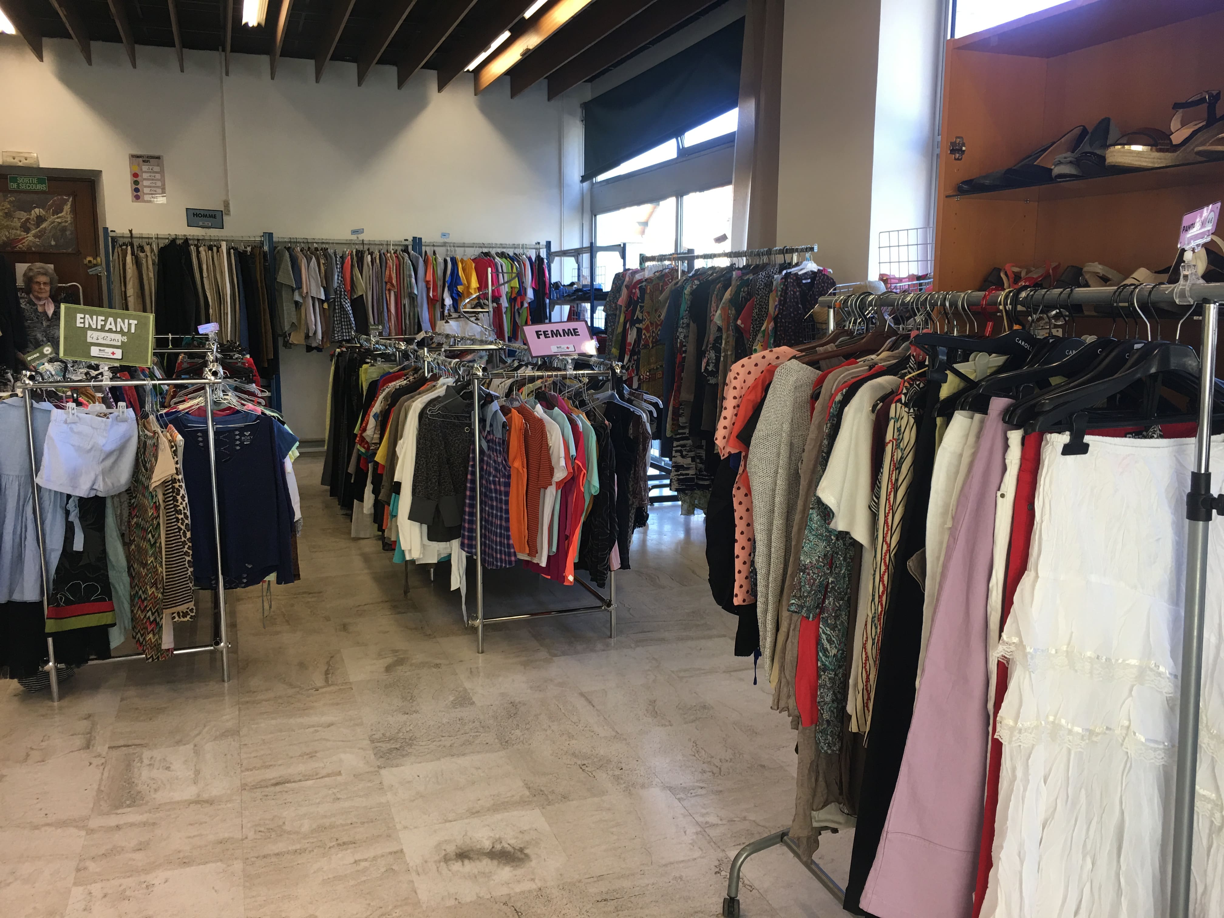Côté vêtements, ouvert à tous, vêtements neufs et de seconde main, des chaussures, du linge de maison, puériculture à petits prix